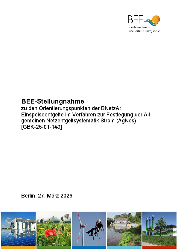 Die BEE-Stellungnahme zu den Orientierungspunkten der BNetzA: "Einspeiseentgelte im Verfahren zur Festlegung der Allgemeinen Netzentgeltsystematik Strom (AgNes)" können Sie als PDF herunterladen.