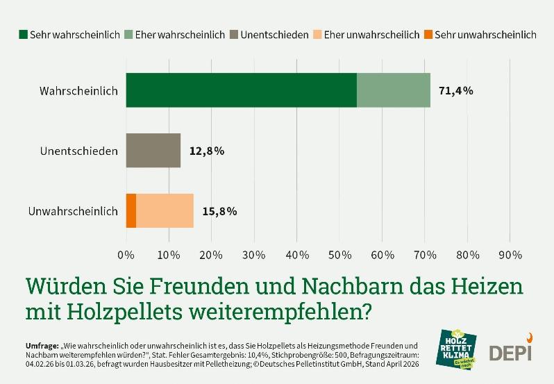 Die Pelletheizungen schneiden laut der Umfrage besonders gut ab und stoßen auf eine hohe Zufriedenheit mit denen, die sie bereits nutzen. Eine absolute Mehrheit von 71,4 Prozent würde die Pelletheizung sehr wahrscheinlich oder wahrscheinlich an Freunde oder Nachbarn weiterempfehlen und zeigt sich damit sehr glücklich mit ihrer Entscheidung. Unentschieden sind in der Frage lediglich 12,8 Prozent und nicht weiterempfehlen würden sie 15,8 Prozent.